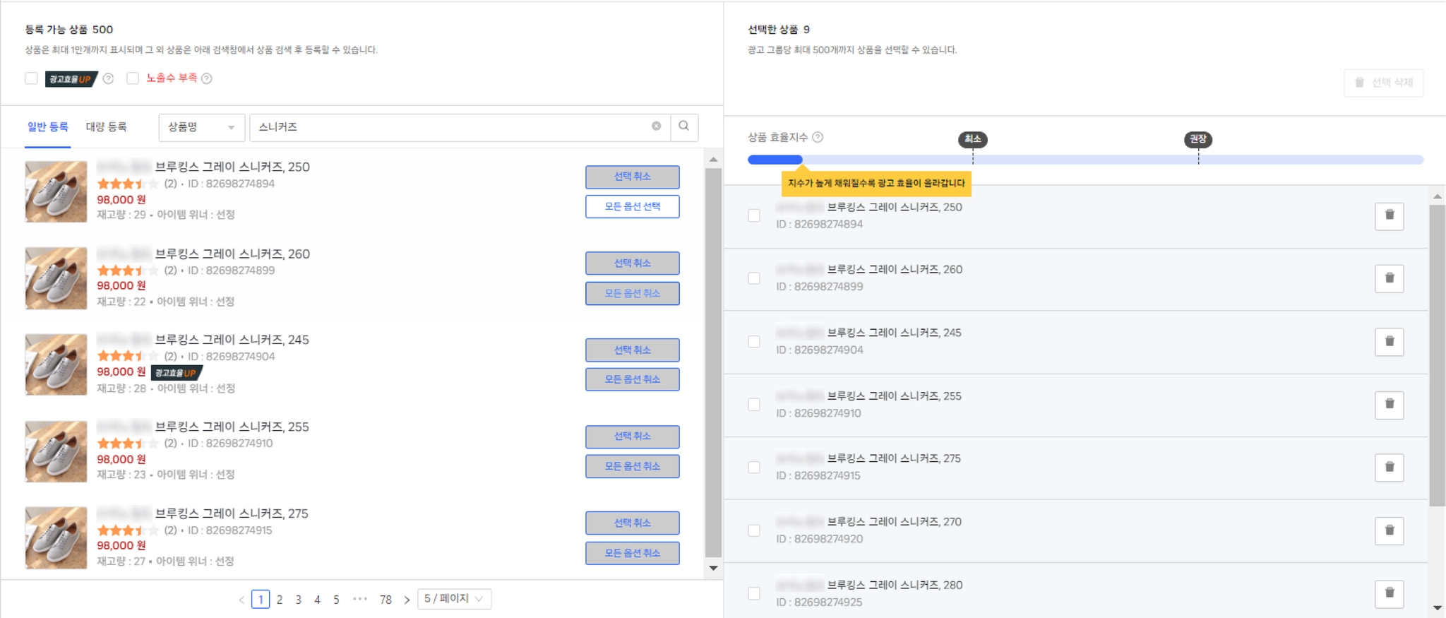 매출최적화 광고의 경우 상품을 선택할 수 있어 내가 해당 상품에 더 높은 예산을 투입하거나 적은 예산을 설정하여 광고비가 낭비되지 않을 수 있어요.