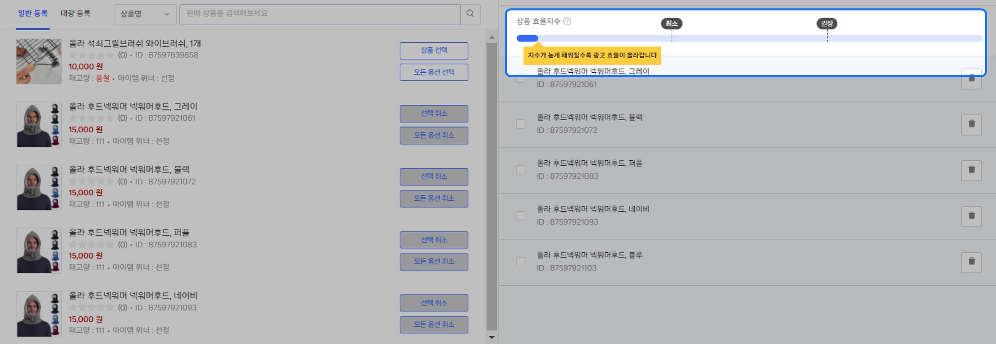 만약 1개의 구매도 일어나지 않았던 상품들만 캠페인에 추가할 경우 머신 러닝의 데이터 역시 믿을 수 없고 그만큼 무작위로 노출이 일어나기 때문에 효율이 좋지 않을 수 있어요.