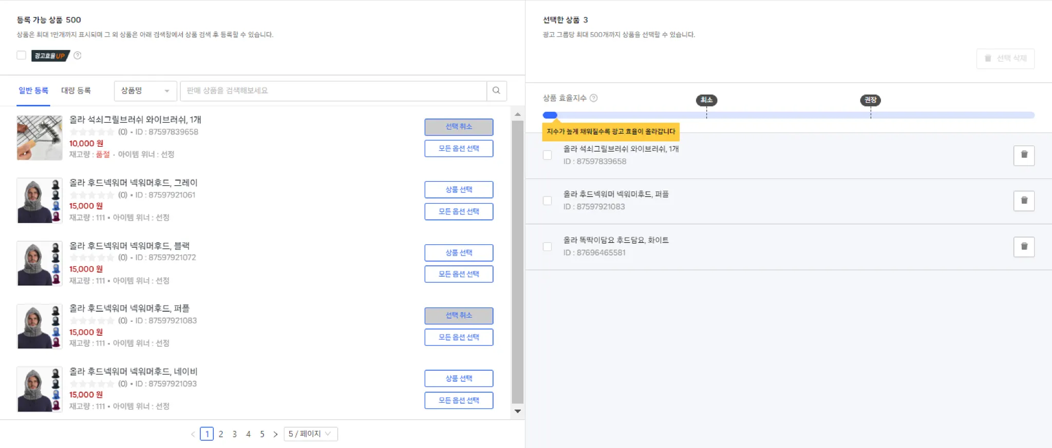 광고 성과 데이터가 보이는 ‘상품 제외 화면’