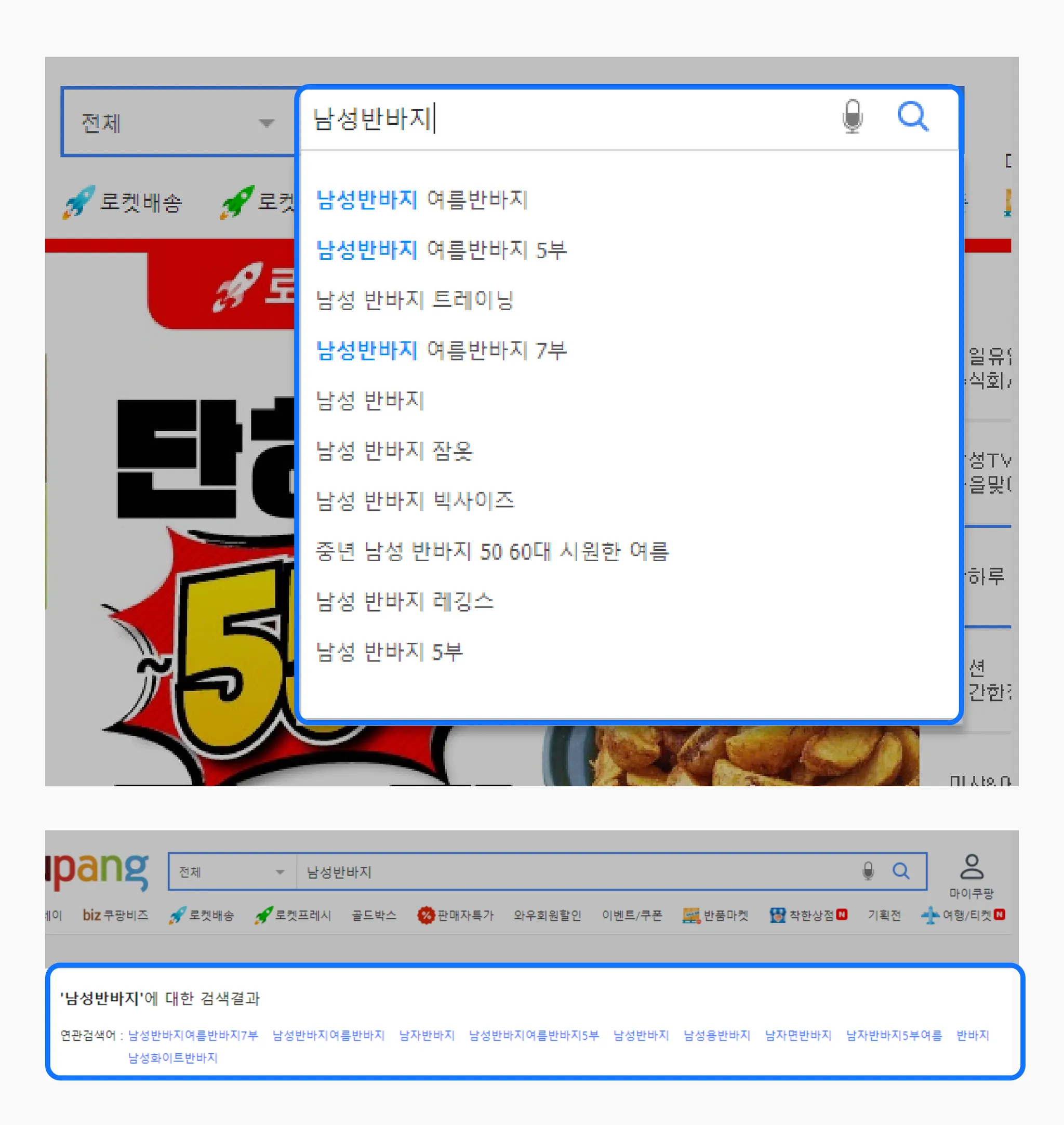쿠팡 실제 자동완성검색어와 연관검색어