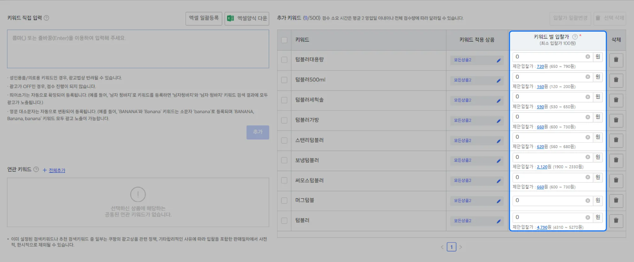 그럼 우리가 “텀블러”라는 키워드에 10,000원을 입찰가로 설정하고 다른 대표님은 2,000원을 설정했다면? 그럼 10,000원에 입찰가를 설정한 상품이 상위에 노출되게 돼요.