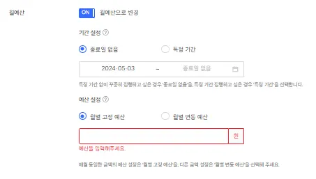 예산은 최소 1만 원부터 최대 10억 원까지 입력이 가능하며 캠페인 별 예산은 광고의 성과를 파악하기 위해 최소 3만 원 이상을 권장하고 있어요.