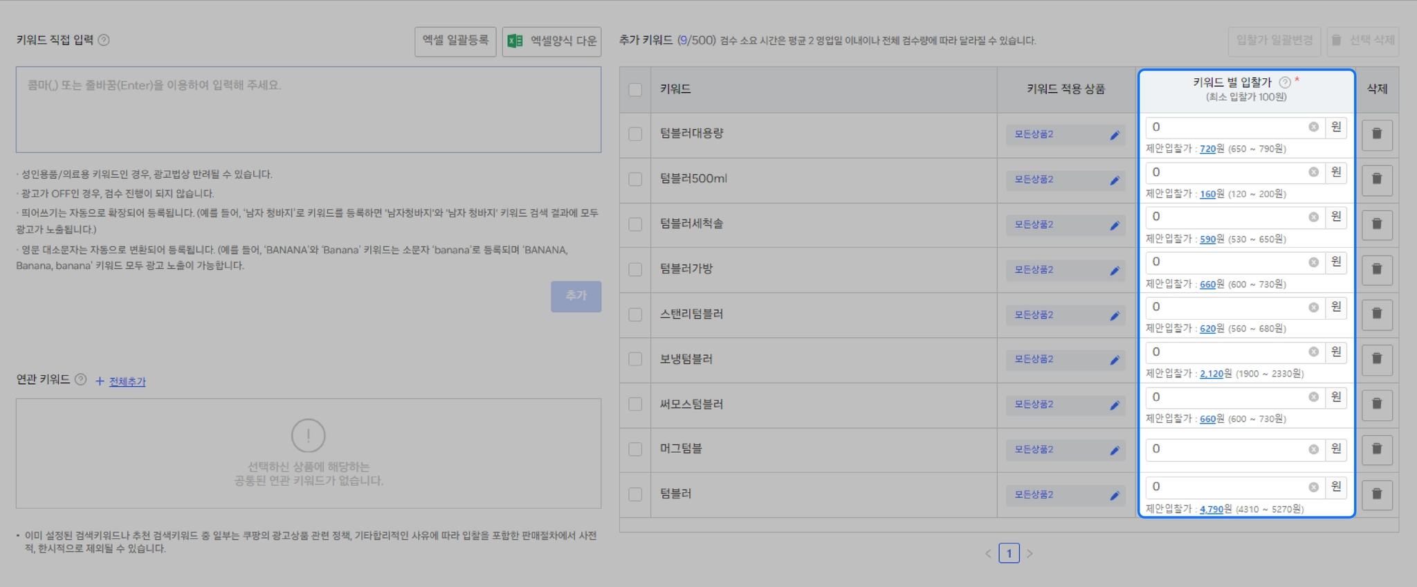 이때 가장 중요한 게 ‘내 상품에 맞는 키워드를 어디까지 추가할 것인가’와 ‘키워드 입찰가’예요