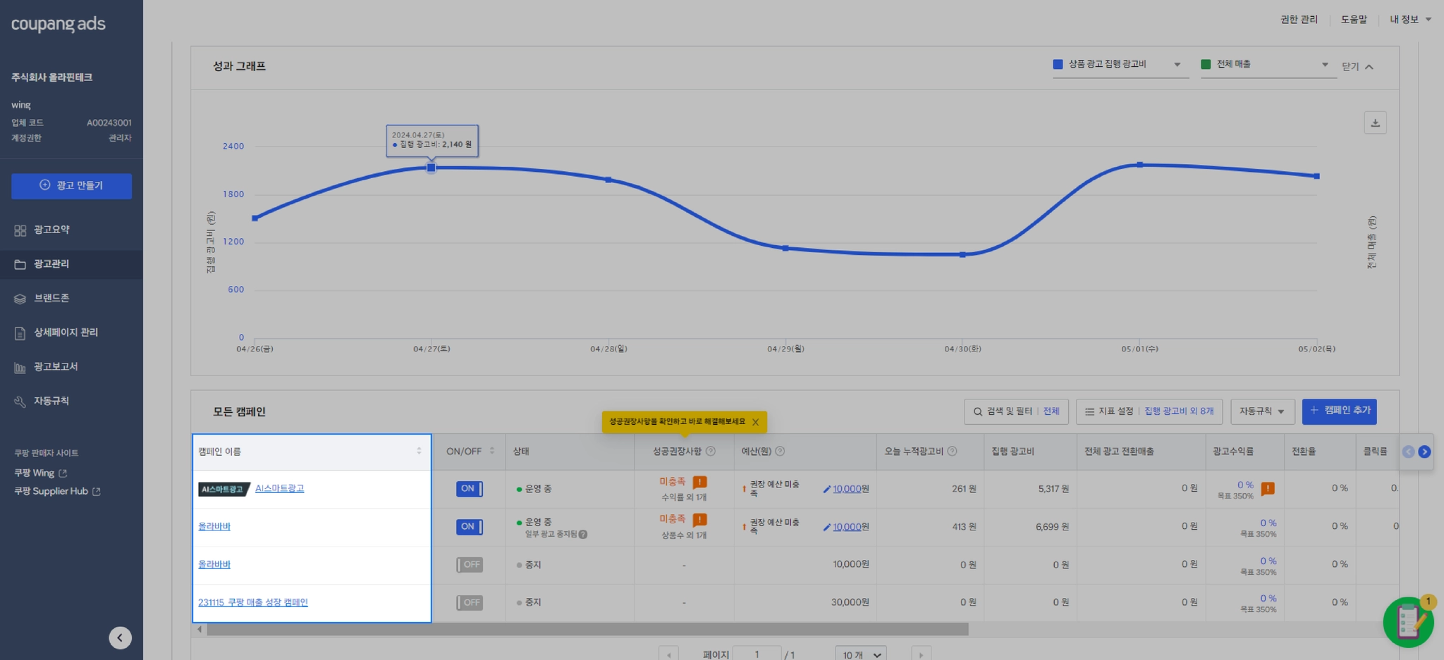 1. 쿠팡 광고 센터에서 캠페인을 선택해주세요