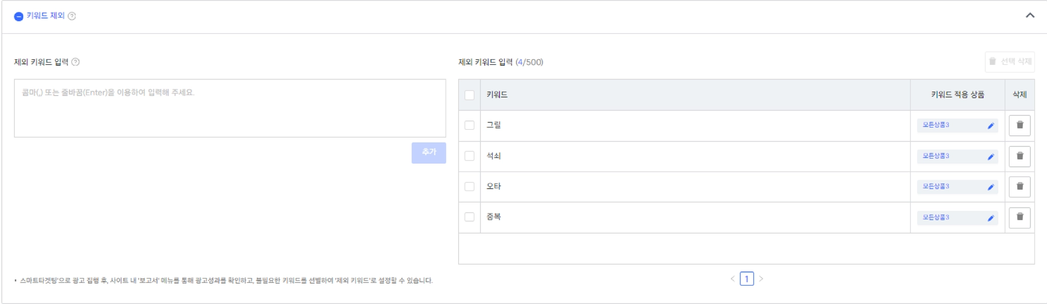 (2) 쿠팡 광고 센터으로 다시 돌아가 원하는 ‘돈 먹는 키워드’를 제외 키워드에 추가 해주세요!
