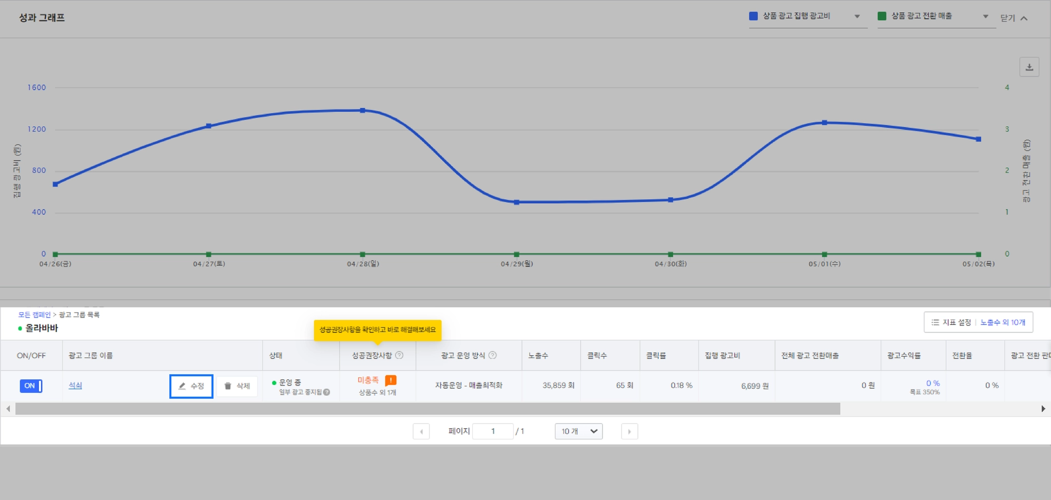 캠페인 이름 위로 마우스 커서를 움직일 시 ‘수정’ 버튼이 활성화되는데 해당 버튼을 클릭하지 말고 예시 이미지에 보이는 ‘올라바바’처럼 캠페인 이름을 클릭해주세요!