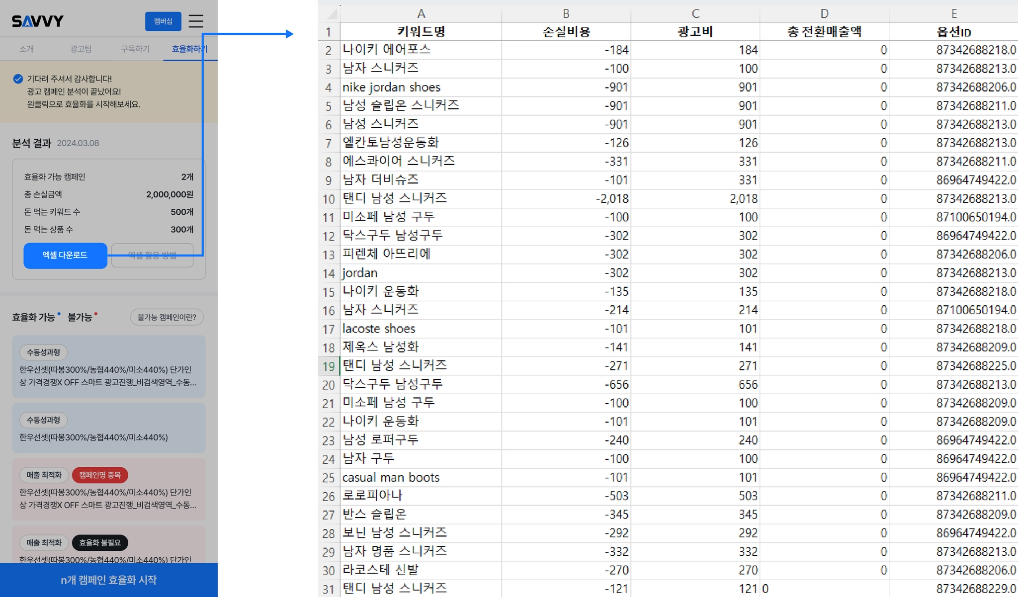 세이비- 효율화 하기 단계 시 보이는 화면/ 엑셀 다운로드 후 보이는 ‘돈 먹는 키워드’ 리스트