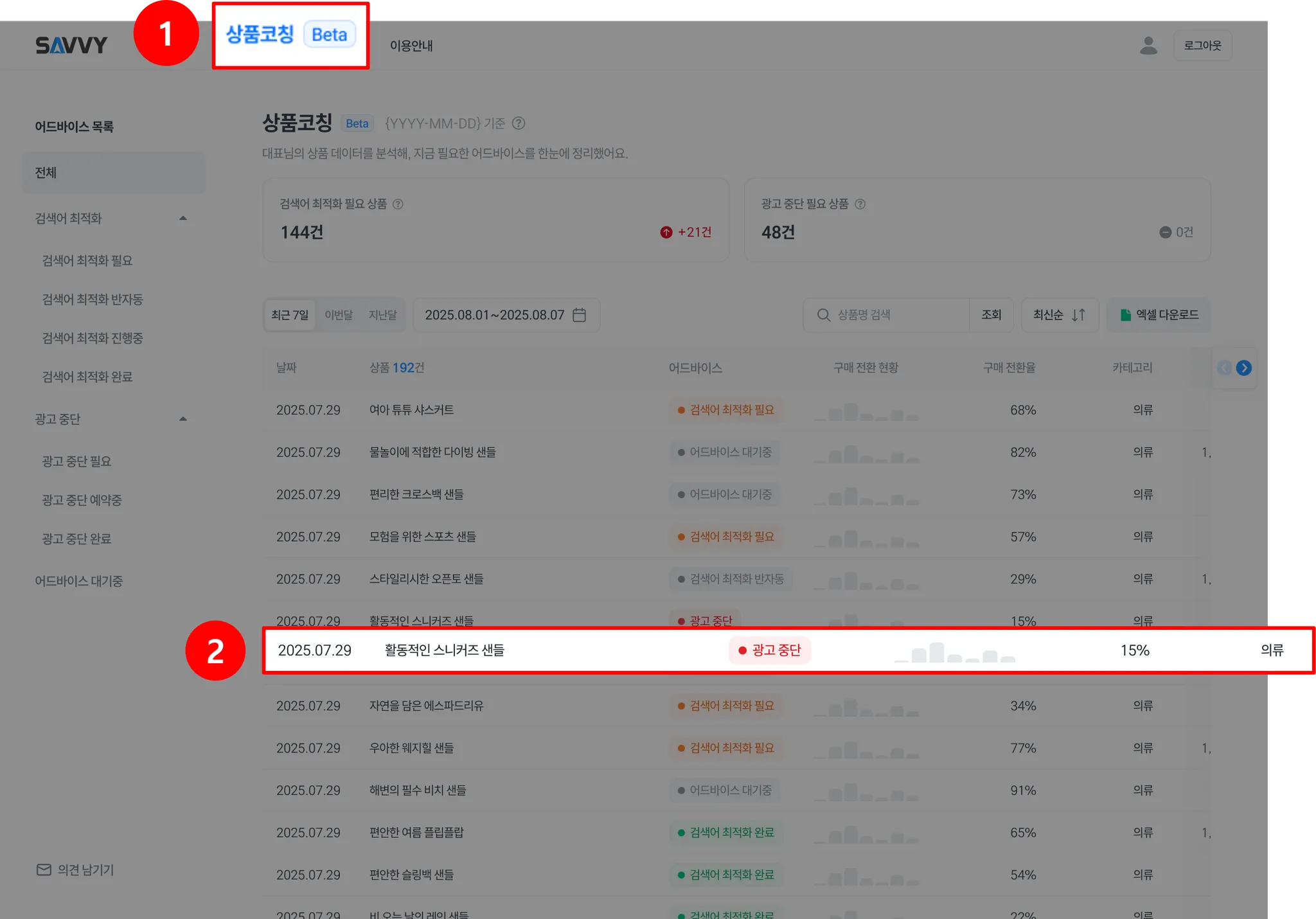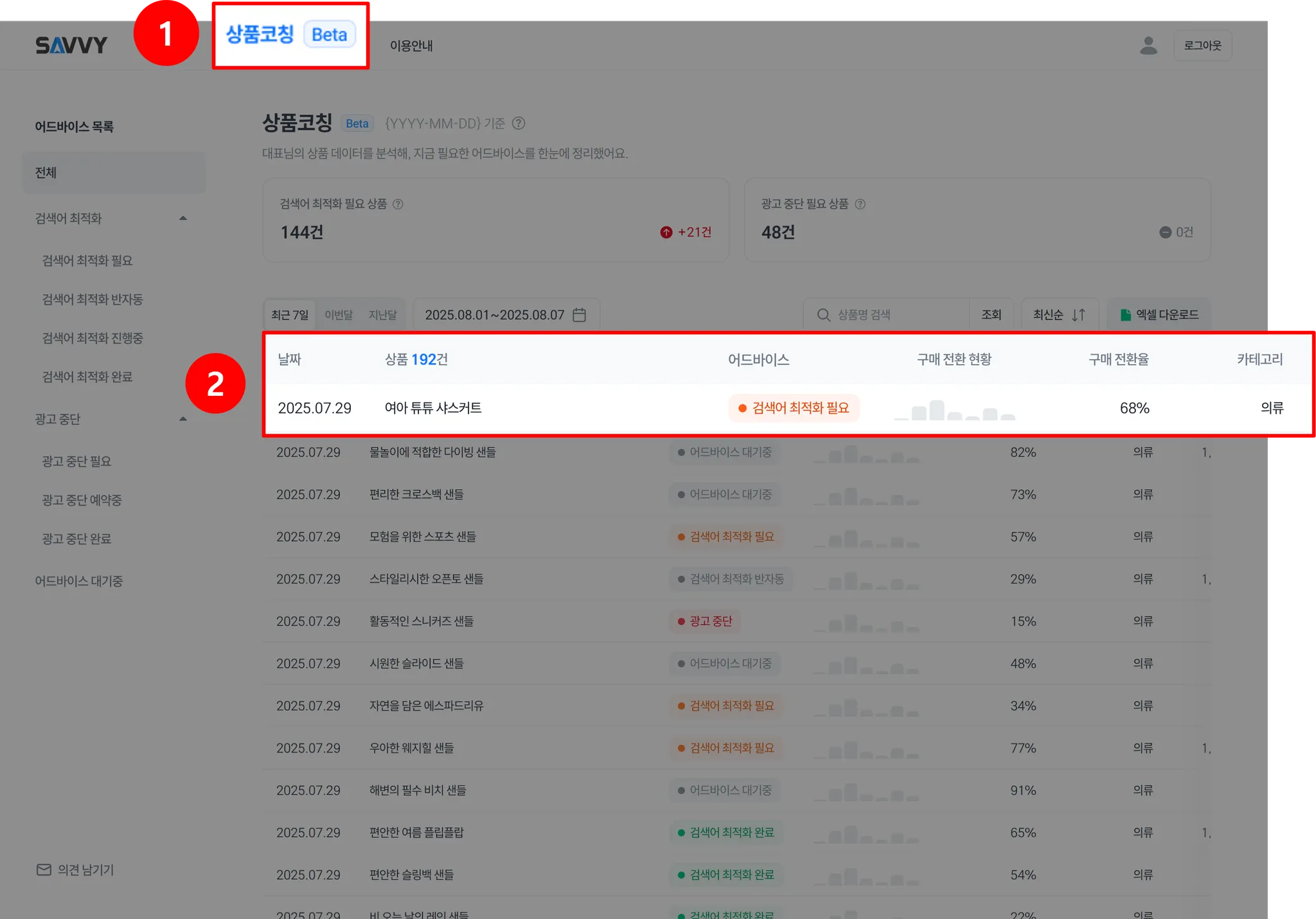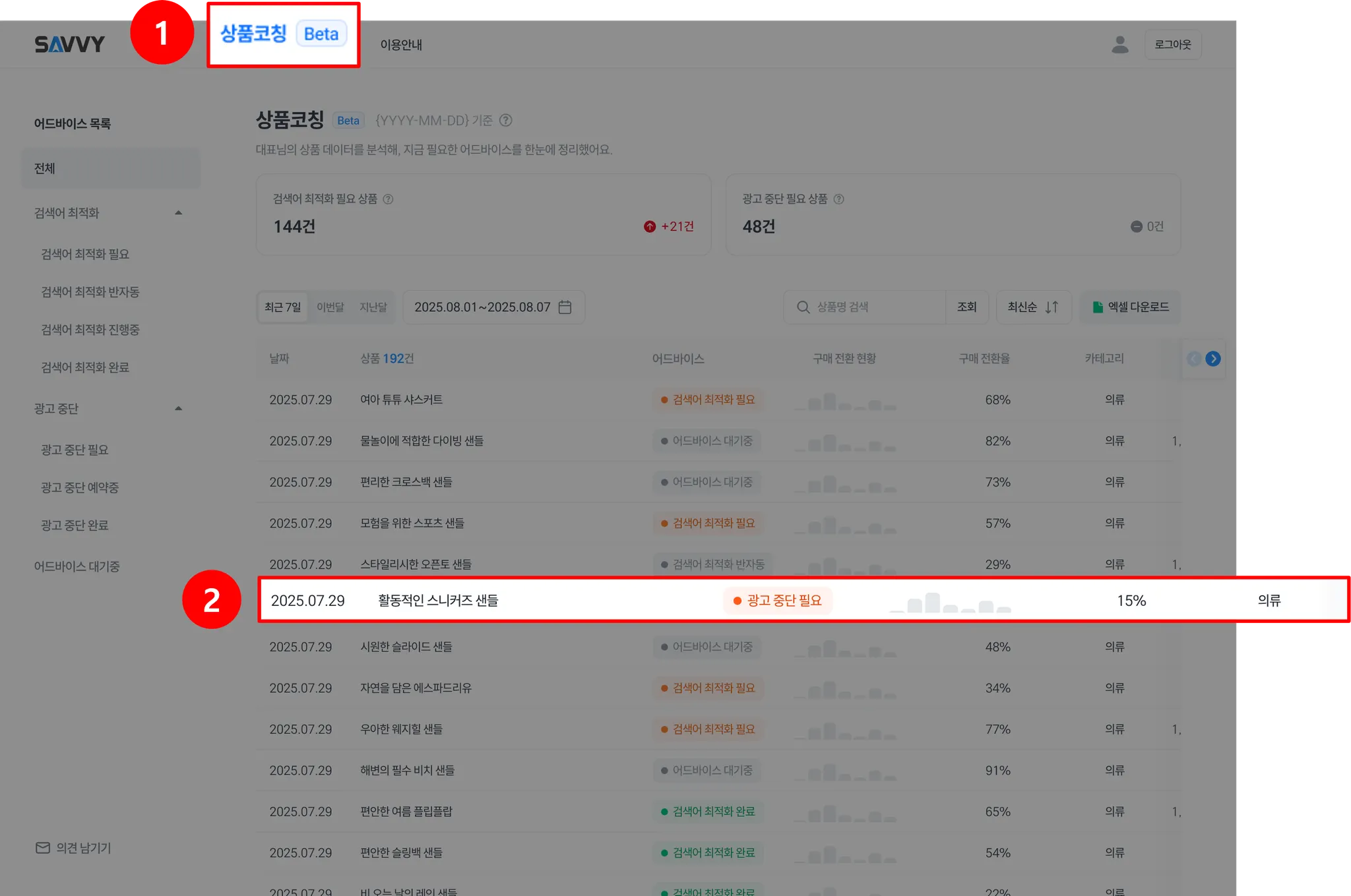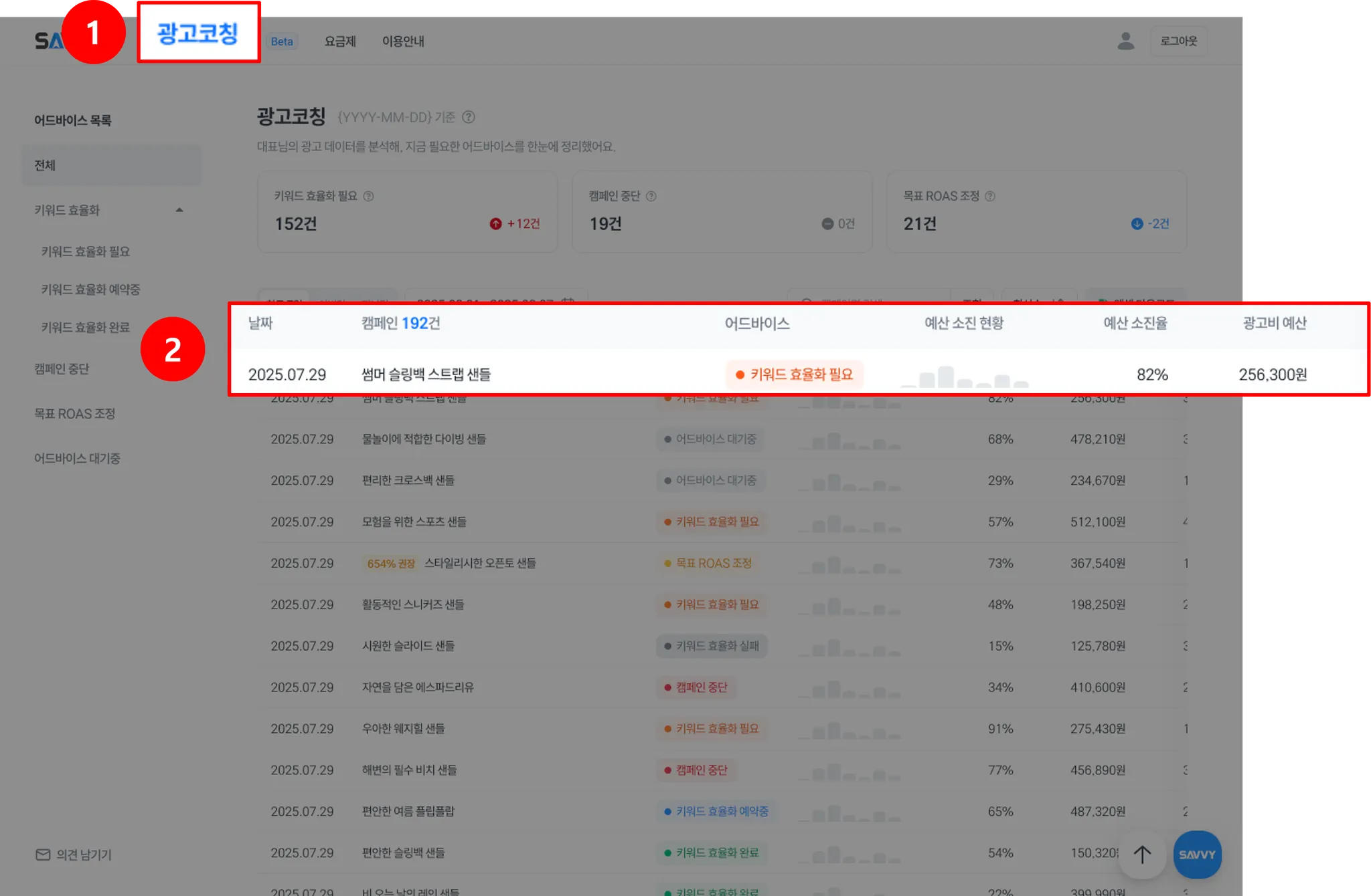 ‘키워드 효율화 필요’ 어드바이스가 표시된 캠페인 아무 곳이나 클릭